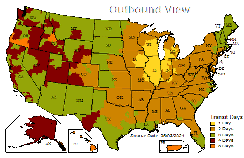 - West Coast, Arizona, Utah, Washington State, Idaho, Dakotas, Nevada, and the western part of Nebraska, Kansas, Colorado, and Texas: Mondays and Tuesdays (arrives in 4 days from ship date);